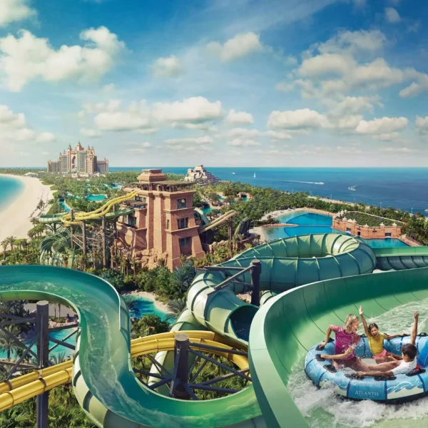 Atlantis Aquaventure Waterpark, located within the iconic Atlantis, The Palm resort in Dubai, is one of the largest and most spectacular water parks in the region. Featuring a blend of high-speed slides, relaxing lazy rivers, pristine private beaches, and unique marine encounters, it offers a perfect mix of adventure and leisure for visitors of all ages. Whether you are seeking adrenaline-pumping rides or a serene beach escape, Aquaventure promises an unforgettable experience in the heart of Dubai.